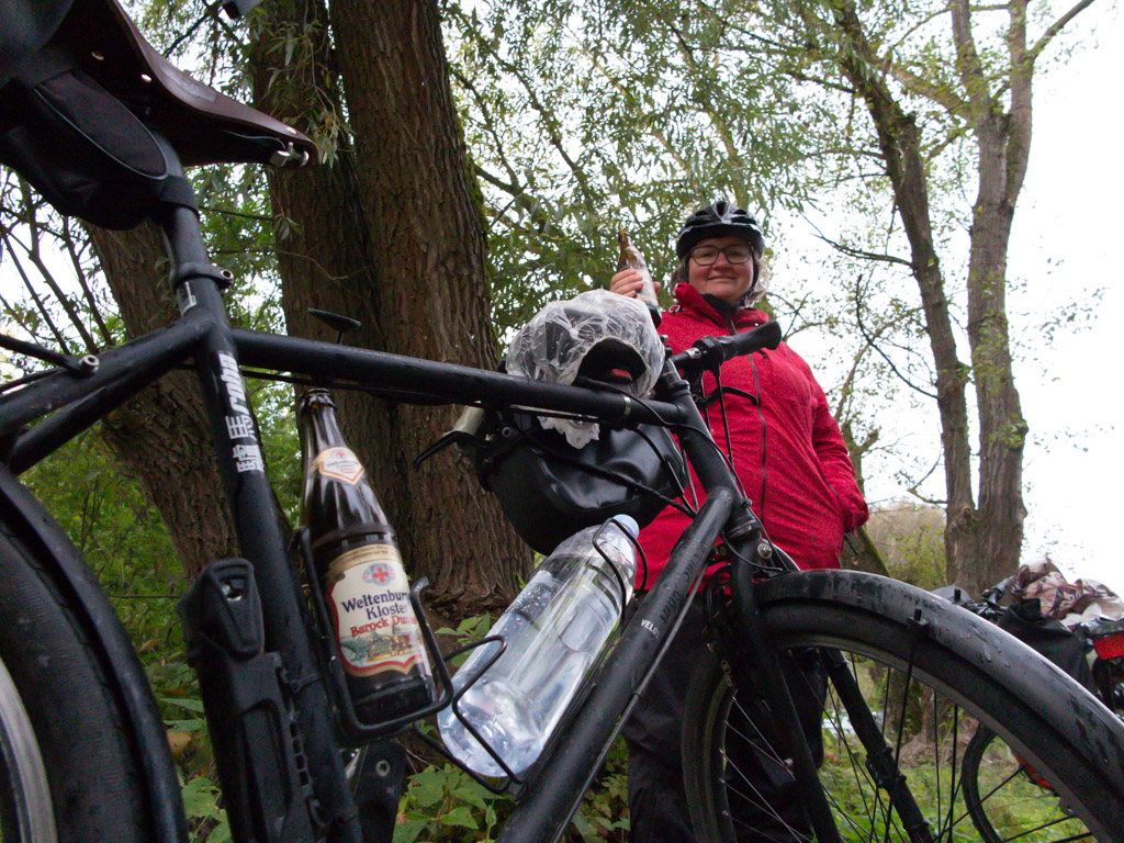 Auf der Strecke setzt auf einmal Regen ein, so dass wir wohl oder übel unterstehen und das erstandene Klosterbier kredenzen müssen.