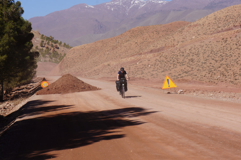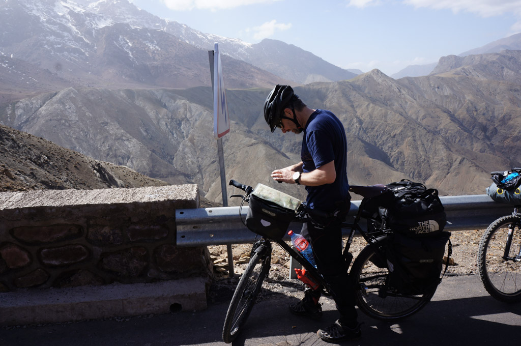 Gestärkt fahren wir los entlang von Gebirgsbächen mit den Viertausendern des Atlas im Hintergrund vorbei an blühenden Mandelbäumen zuerst immer wieder auf und ab, dann stetig aufwärts. Ungefähr einen Kilometer vor der Passhöhe beklagt sich mein Bruder über ein streifendes Hinterrad. Beim näheren hinsehen stellen wir eine gebrochene Hinterradfelge fest. Es ist bereits nach drei Uhr am Nachmittag und wir wollen es unbedingt noch bis Telouet schaffen. Jetzt sind Ideen gefragt. Schleunigst wird das Hinterrad ausgebaut, der Reifen demontiert und die gebrochene Felge mit einem SIM-Kartenträger aus Marokko und Klebeband repariert. Der Schaden scheint behoben zu sein und wir erreichen überglücklich die Passhöhe.