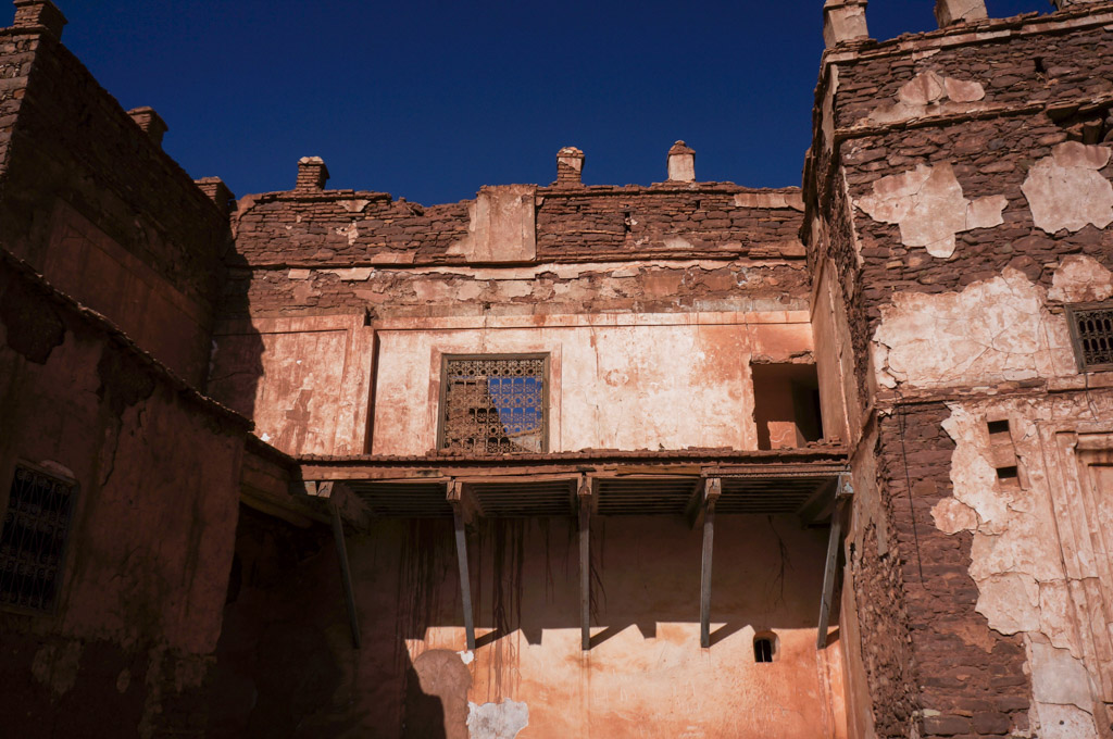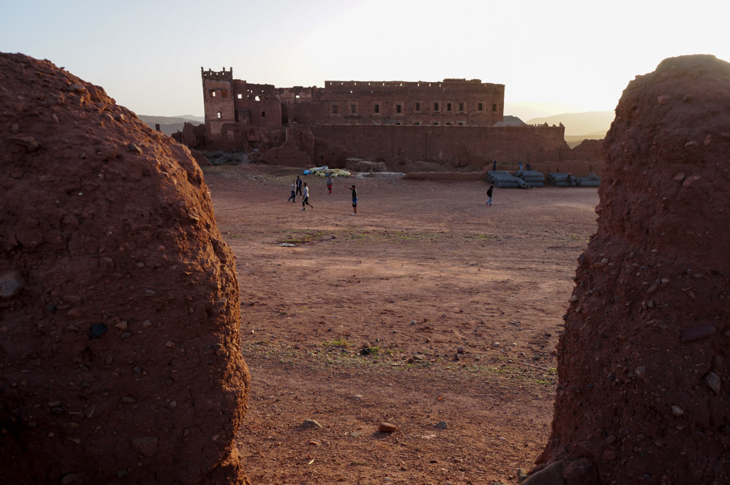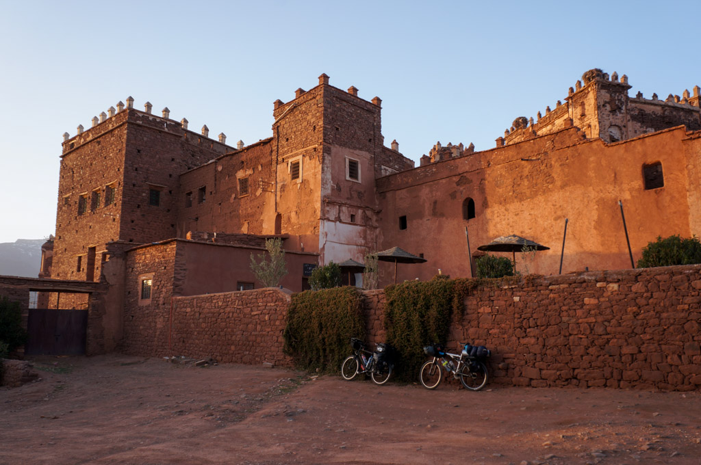 Die Fahrt vom Pass muss Tom allerdings nur mit der Vorderbremse bewältigen. Leider werden auch die Strassen schlagartig schlechter, was die Sache nicht erleichtert. Doch die grandiose Landschaft in der Abendsonne lässt den Schaden schnell vergessen und wir schaffen es mit den letzten Sonnenstrahlen nach Telouet und sehen die Kashba in schönstem Abendlicht. Wir wollen auf dem örtlichen Camping übernachten aber für den kleinen Aufpreis von wenigen Dirham wählen wir doch das Hotelzimmer um endlich wieder warm zu duschen und die Geräte zu laden. Allerdings wird aus der warmen Dusche nichts, denn es kommt nur eisig kaltes Wasser. Dafür sind wir die einzigen Gäste im Hotel und bekommen eine sehr feine Tajine aufgetischt. Zusätzlich erhalten wir noch ein Livekonzert mit Berbermusik von Hamid aus Mali.
