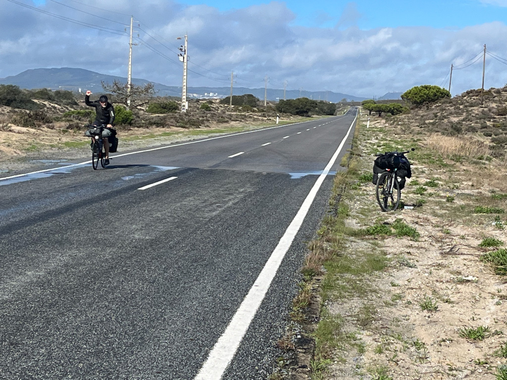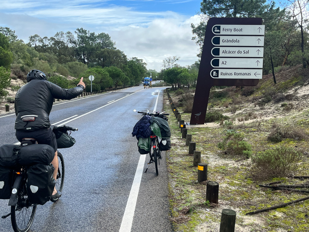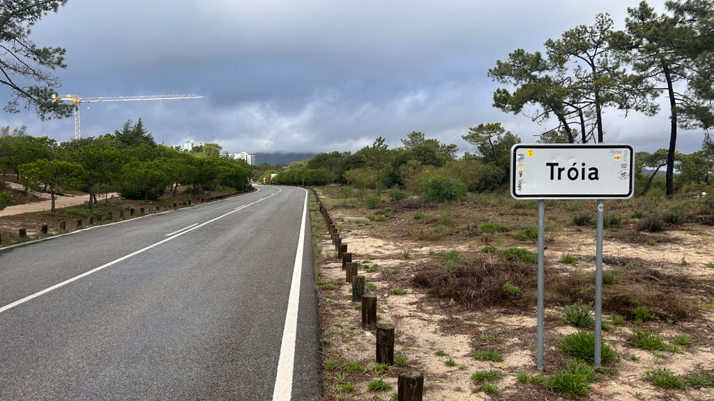 Vermeintlich gibt es nur eine Strasse nach der Fährüberfahrt von Setúbal auf der Landzunge Richtung Süden. Die Bedienung des Touchscreens am Mobiltelefon ist bei Regen denkbar schlecht. So radeln wir einfach drauf los bis wir an der nördlichen Spitze der Landzunge in Tróia ankommen und mit Schrecken feststellen müssen, dass wir in die falsche Richtung gefahren sind.