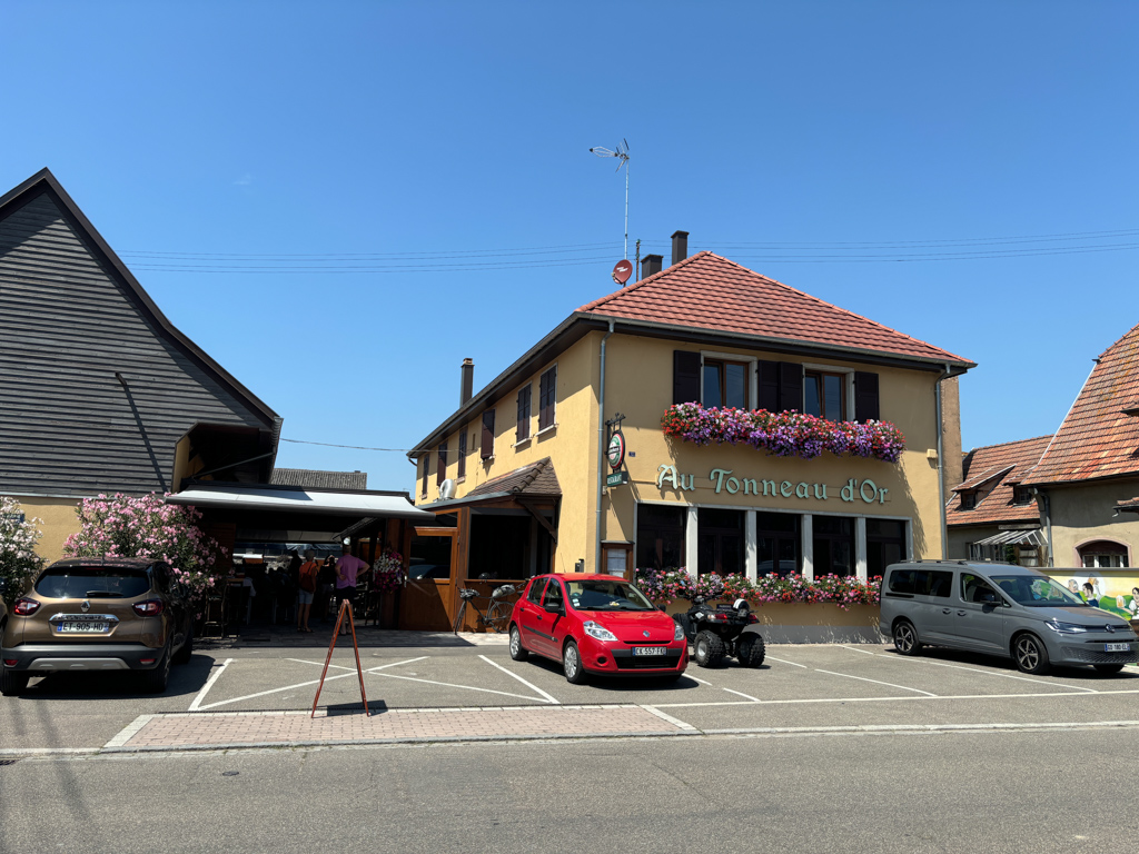 Unser Credo lautet nichts voraus zu reservieren und uns nach Köln treiben zu lassen. Doch zusätzlich acht Kilometer zu machen und wieder abgewimmelt zu werden ist uns dann doch zu riskant. So versuchen wir unser Glück auf der deutschen Seite und fragen telefonisch zu Sicherheit nach ob es noch ein kleines Plätzchen für zwei schmale Jungs hat. Die Stimmung wird blitzartig besser als wir mit einem kühlen Bier in der Hand die Bestätigung erhalten. Es ist sowieso besser im deutschsprachigen Raum den wir werden wegen unserer Sprache nicht kritisiert wie beim Mittagessen im Elsass. Aber dieser Dialekt versteht sowieso keiner. Auch die Dichte an Biergärten war an der Strecke bis jetzt sehr überschaubar. Nur ein schöner Garten war offen ab 12:00 Uhr. Leider ist erst 11:00 Uhr. Obwohl es sehr fein aus der Küche duftet, verduften wir von n hier dennes warten noch einige Kilometer auf uns und es kommt bestimmt die nächste Gelegenheit. Die kommt aber leider erst in Sunhouse.