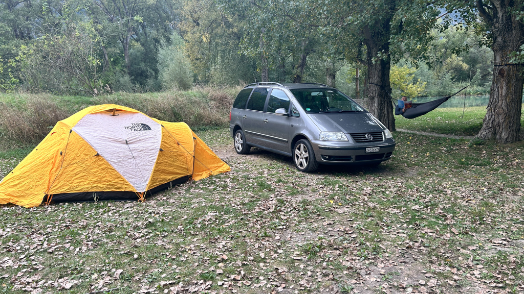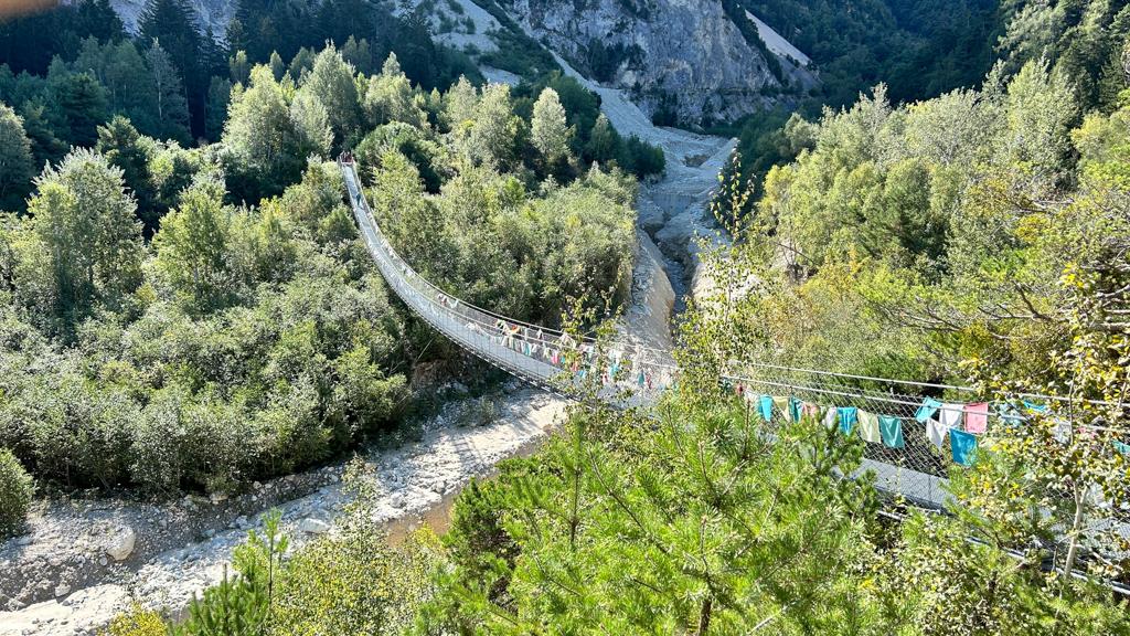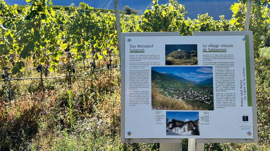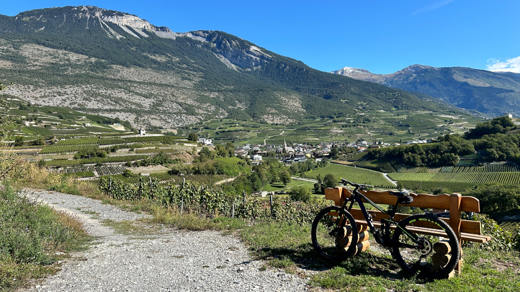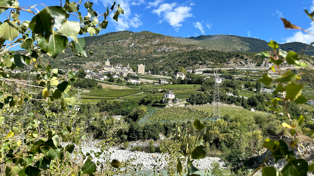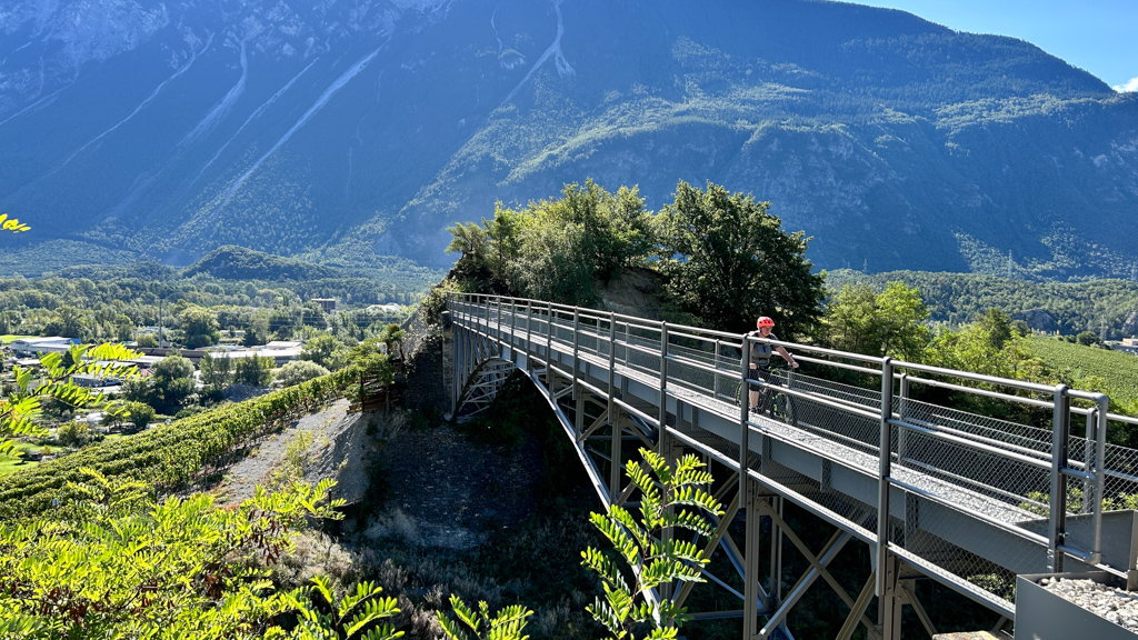 Das Ziel ist aber nicht das Wadtland sondern das Mittelwallis. Salgesch ein idealer Ausgangspunkt für diverse Aktivitäten in der Region. Auf dem Campingplatz Swiss Plage finden wir eine schöne Parzelle für unser Zelt. Die erste Nacht ist zwar um die fünf Grad aber immerhin trocken. Salgesch gilt auch als einer der trockensten Orten in der Schweiz. Da an vielen Orten in der Schweiz und Norditalien Regenfälle vorausgesagt wurden, haben wir ns für diese Ecke der Schweiz entschieden. Zudem weilt unsere Tochter mit ihrem Freund für ein paar Tage hier an diesem schönen Ort. Eine wunderbare Gelegenheit gemeinsam eine Wanderung durch den Pfynwald zu unternehmen und endlich einmal über die Buthanbrücke zu marschieren. Die Traubenernte hat bereits begonnen und der vergorene Traubensaft muss degustiert werden. Auch kulinarisch kommen wir nicht zu kurz hat doch die Wildsaison begonnen. Aber nicht nur Wandern steht auf dem Programm sondern auch einige Mountainbike Touren. Die erste Tour führt uns durch die Rebberge nach Varen und der „Grossi Wasserleitu“ (Suone) entlang zurück nach Salgesch. Richtig Spass macht der Downhill Trail zurück ins Dorf.