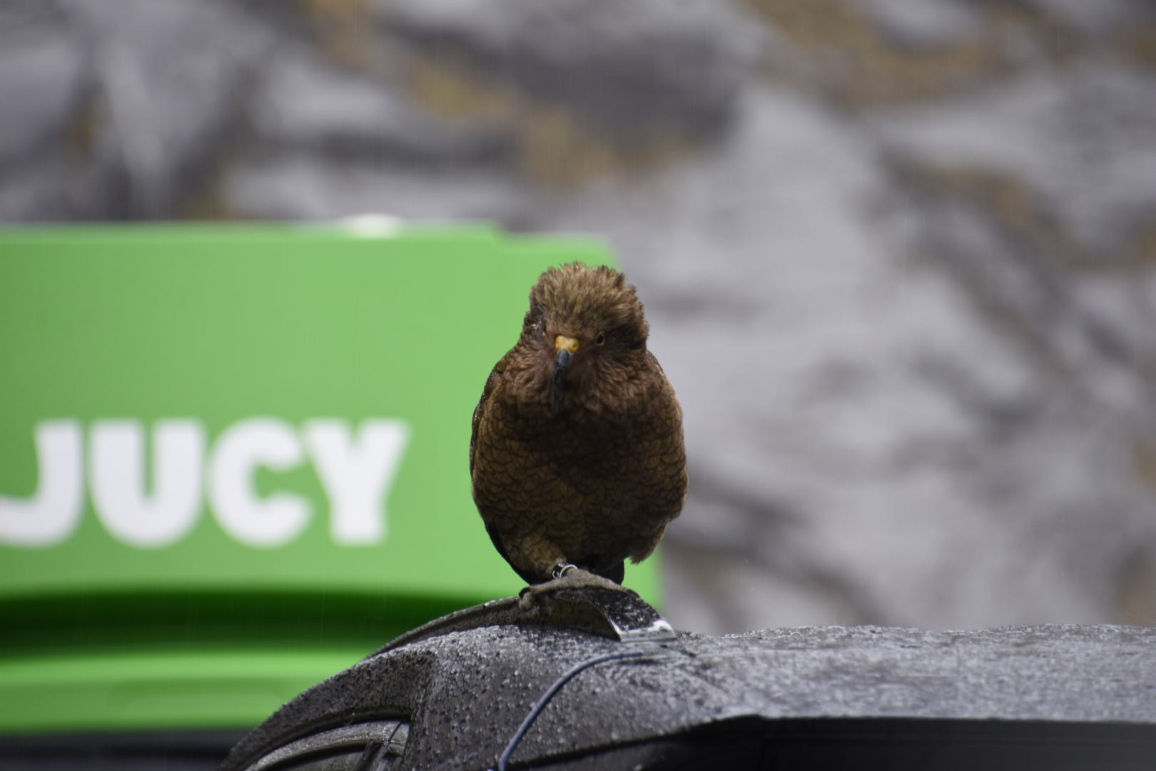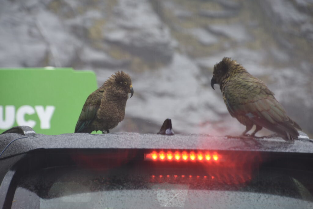 Die frechem Keas, eine Papageienart, hat es beim Warten am Rotlicht auf die wartenden Aiutos abgesehen. Auch Türgummis und andere Teile sind offenbar nicht sicher von diesen intelligenten Vögeln. So zumindest gibt es eine Warnung im Reiseführer.