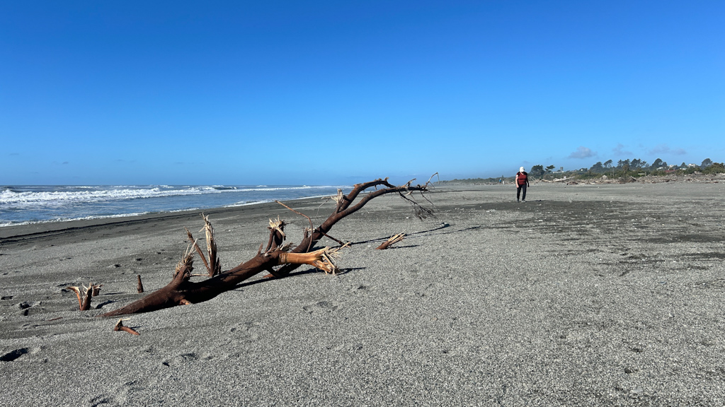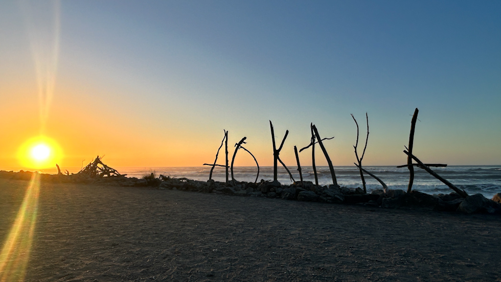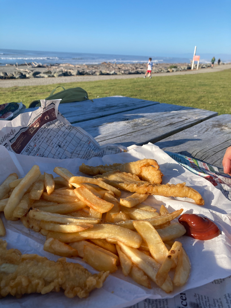 In Greymouth geniessen wir die Sonne am Strand bevor es zurück nach Hokitika geht. Den Sonnenuntergang geniessen wir mit fish&chips am Strand.