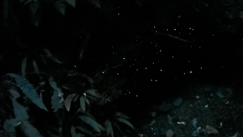 Es ist zu Fuss nicht weit bis zur nächsten Atraktion. In Hokitika gibt es nämlich nochmal Glühwürmchen zu besichtigen. Carweise werden Touristen herangekarrt und der Parkplatz ist schon voll. Zum Glück können wir zu Fuss gehen.