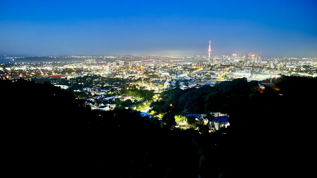 Dies bemerken wir allerdings erst nach dem Besuch vom Auckland Hafen, Funkturm und Innenstadt. Hier rollt der Rubel. Wir übernachten im Zelt auf günstigen Campingplätzen und hier liegen Jachten in Milionenhöhe. Trotzdem möchte ich nicht tauschen. Weil es so schön war, besteigen wir den Maungawhau gleich ein zweites Mal, diesmal nach Sonnenuntergang.