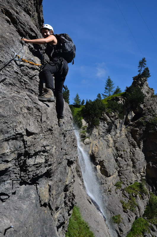 Bereits im Einstieg zur Wand sind wir nicht die einzigen Kletterer. Während des ganzen Aufstieges sind wir in Begleitung. Es ist zu Recht einer der schönsten und abwechslungsreichsten Klettersteige der Schweiz. Das haben auch Andere erfahren. Nach gut zweieinhalb Stunden haben wir die 550 Höhenmeter überwunden und sitzen bei einem Most und einer feinen Almenalpplatte im Bergrestaurant. Nach dieser Stärkung haben wieder genug Energie um den zweistündigen Abstieg nach Kandersteg unter die Füsse zu nehmen.